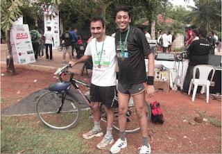 I started the 2nd 5Km run with stiff and sore legs. Honda-San (the Japanese super ultra runner) led the way encouraging and cheering me and all the runners we saw along the way. His enthusiasm and energy was incredible. While I struggled to keep up with Honda-San I focused on keeping my pace below 5 minutes per Km. It was specially difficult during the return leg as my hamstrings began to hurt. It was a big relief to turn back into the Prakruthi entrance and finish the race to the cheering of lots of friends with my Garmin showing 1:43:44. The official timings showed that I finished in 1:44:44(the 2nd 5K taking 24:33) - 21st overall and 4rth in my age category. While I was a bit disappointed that I ended up finishing at the higher end of my target timing of between 1:40 and 1:45 and missed the age category 3rd place by less than half a minute, I was overall quite satisfied and enjoyed the experience thoroughly. The top three finishers in the event finished in amazing timings of under 1:19 - completing the 20 Km cycling in under 40 minutes and each 5Km leg well under 20 minutes !!! Neera Katwal who rode with us to the event showed amazing grit and perseverance. Despite falling off her cycle and injuring herself due to a crash between two cyclists in front of her cycle, she won the women's category finishing in 1:47:46. My son Rahul also completed his 1st duathlon in 1:16:41 in the short category - a wonderful achievement to add to his 1st 10K at the SW10K 2010 in May.